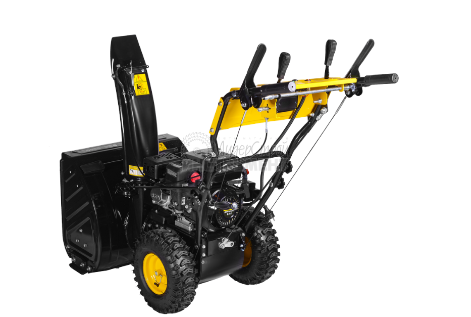 Элементы управления агрегатом расположены на рукоятке. Ручки переключения передач, установки направления выброса снега размещены на корпусе.