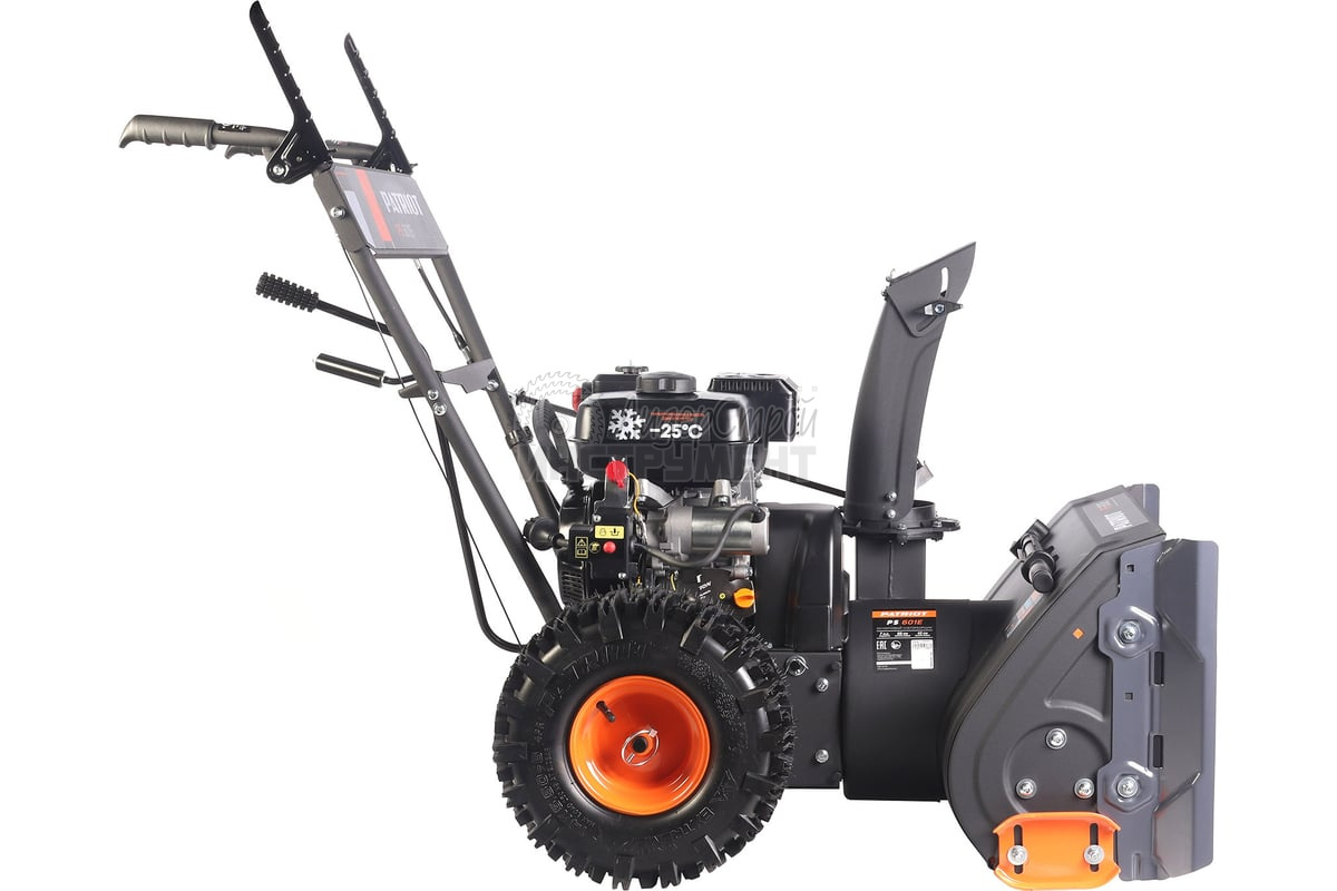 Элементы управления агрегатом расположены на рукоятке. Ручки переключения передач, установки направления выброса снега размещены на корпусе.