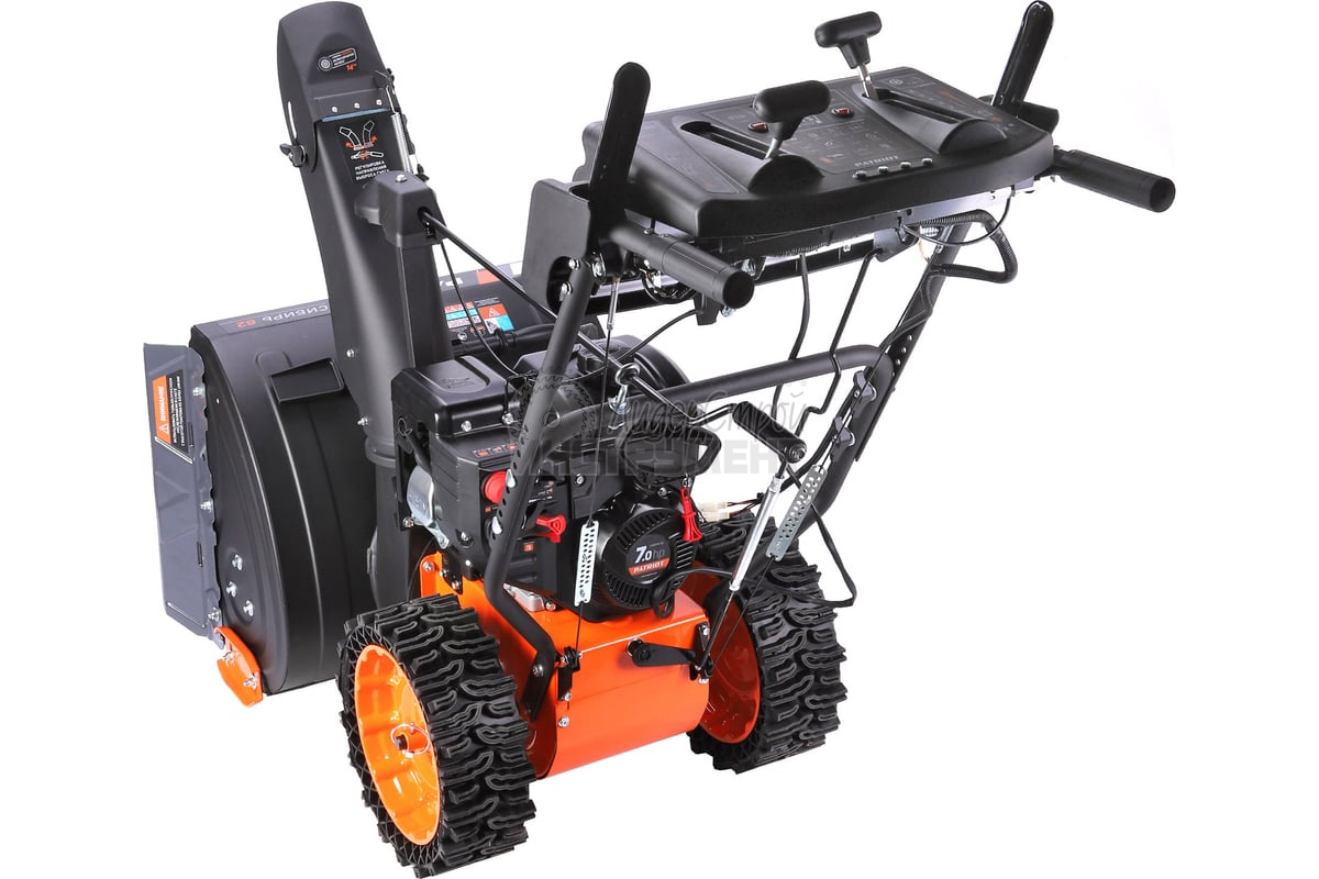 Элементы управления агрегатом расположены на рукоятке. Ручки переключения передач, установки направления выброса снега размещены на корпусе.