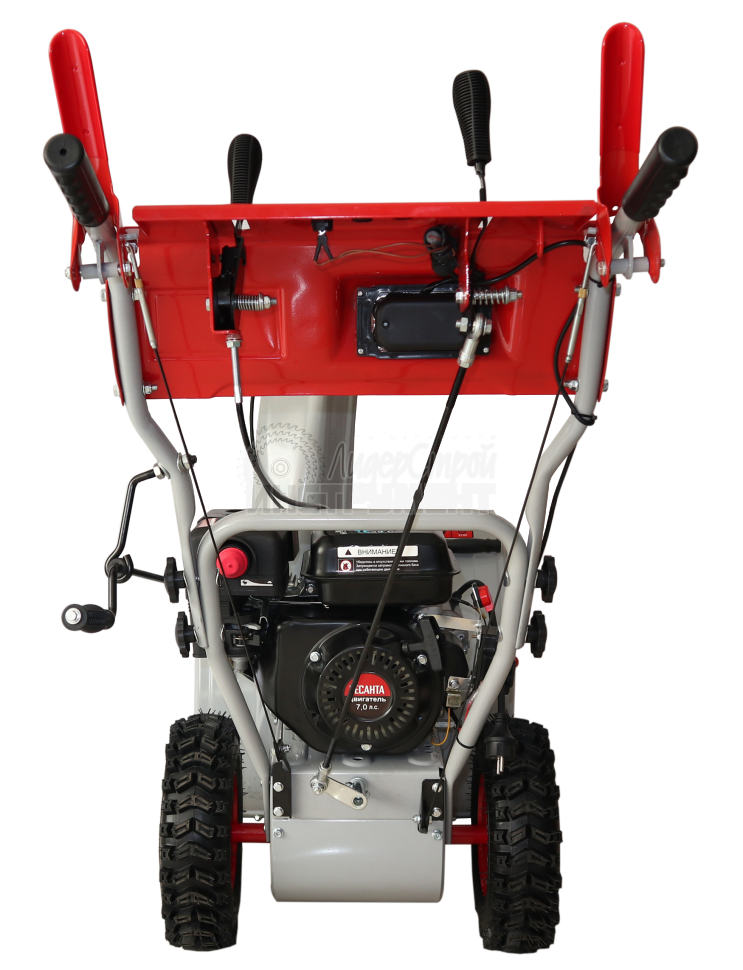 Элементы управления агрегатом расположены на рукоятке. Ручки переключения передач, установки направления выброса снега размещены на корпусе.