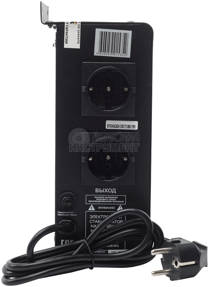 Выравнивает напряжение до 220 В с точностью до 8%. Мощность при входном напряжении 190 В - 300 Вт. Стабилизация напряжения происходит дискретно. Скорость стабилизации - 5-7 мс. При возникновении риска перегрузок или короткого замыкания прибор автоматически выключается. По возвращении входного напряжения в рабочий диапазон (110-260 В) потребители подключаются повторно. Прибор оборудован вольтметрами, считывающими напряжение на входе и выходе. На фронтальной панели размещены выключатель, цифровой дисплей, индикаторы состояния сети, кнопка вывода на дисплей параметров вольтметра. Снабжён двумя выходными розетками.