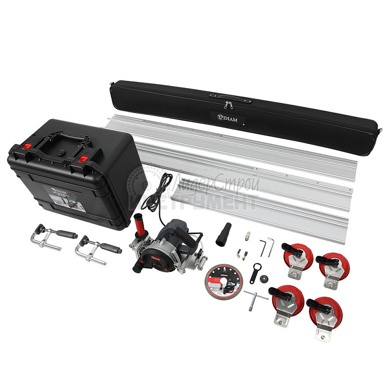 Профессиональная система резки DIAM EX-320E предназначена для раскроя любого типа керамической плитки больших форматов (например, керамогранит, мрамор, кварцевый агломерат) длиной до 3200 мм и толщиной до 17 мм. Система реза состоит из 3 направляющих общей длиной 3200 мм, электрической режущей каретки с режущим диском Ø125 мм, 4 присосок, 2 струбцин для резки рельефной керамики, а также соединительных элементов.