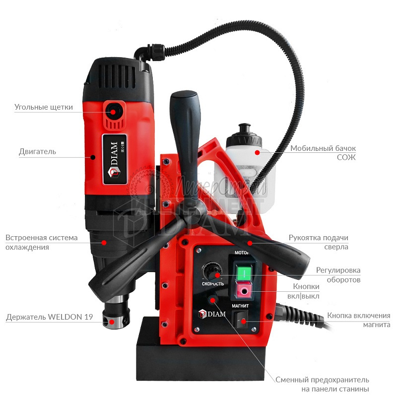 Магнитный сверлильный станок представляет собой электродвигатель с заданной мощностью и числом оборотов. На корпусе имеется ручка плавной регулировки переключения скорости вращения. Шпиндельный узел имеет держатель для сверел WELDON 19. Транспортировочная ручка, расположенная на стойке обеспечивает легкое перемещение сверлильной машины. Станки снабжены предохранителями. Встроенная система охлаждения при работе подает СОЖ в автоматическом режиме. Большой рабочий ход станка позволит с легкостью менять корончатые сверла и упростит центрирование отверстия.