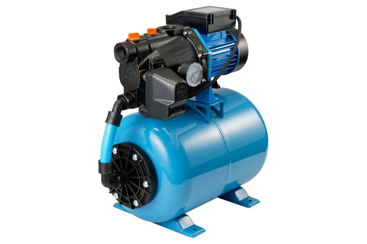 Гидроаккумулятор объемом 24 л снижает нагрузку на двигатель, предотвращает гидроудары и накапливает резервный запас воды на случай отключения электричества.