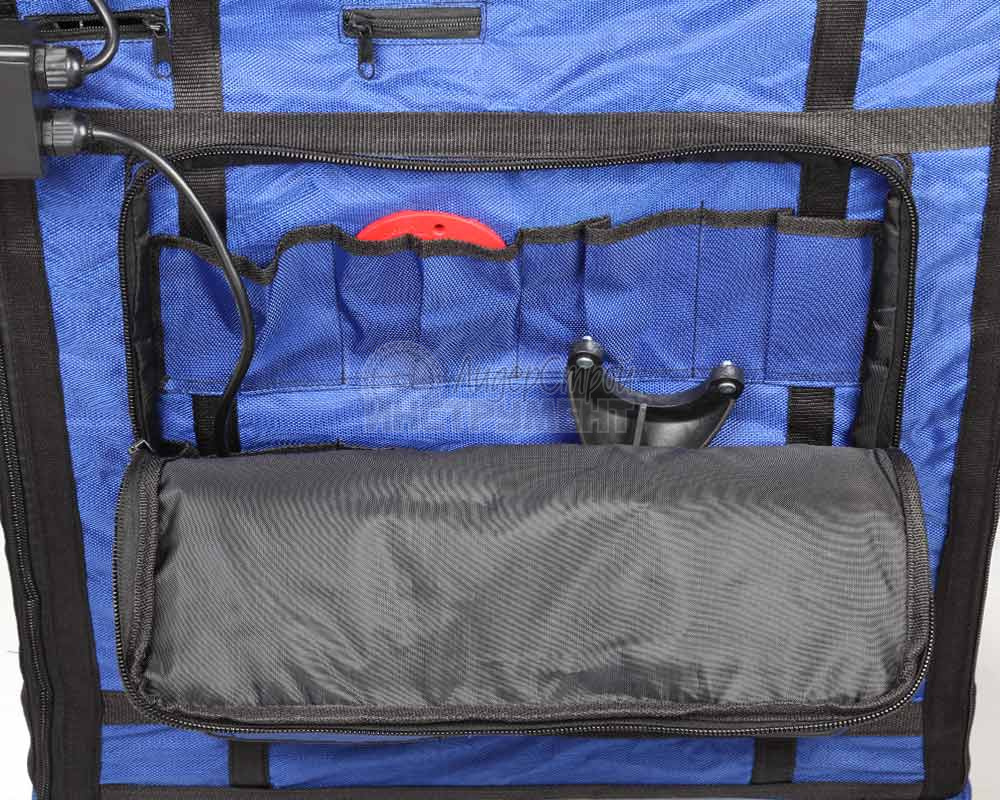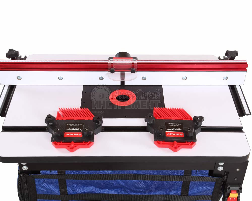 На каркас крепится чехол- стружкосборник с боковыми карманами для аксессуаров. В передней части чехла- стружкосборника есть откидной клапан, открывающий доступ к внутреннему объему фрезерног стола. В чехле имеются два патрубка для удаления отходов резания – 63 и 100 мм.