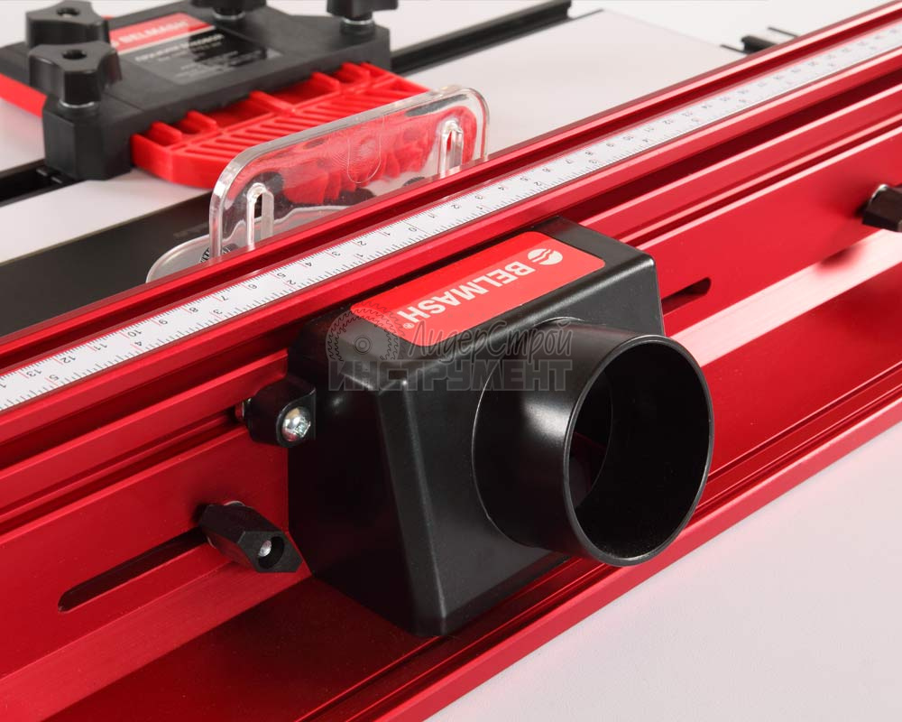 Представляет собой металлический сборный каркас на четырех регулируемых ножках, сверху которого крепится рабочий стол из МДФ со стандартным пазом 19×9,5 мм. На стол устанавливается параллельный упор с патрубком для отвода стружки.