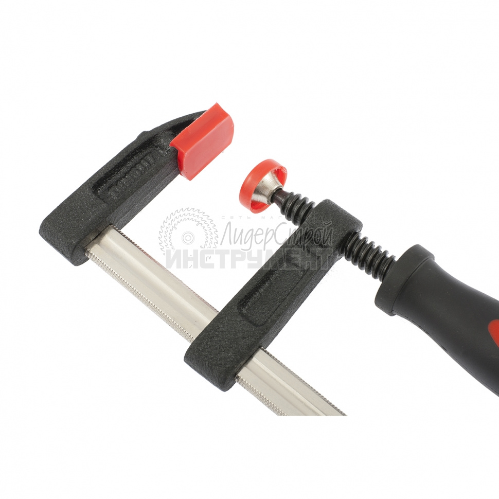 Корпус G-образной струбцины покрыт порошковой краской, стойкой к механическим повреждениям и надежно защищающей струбцину от коррозии. Губки снабжены накладками, предотвращающими повреждения обрабатываемых предметов. Винт струбцины с крупной червячной резьбой и воротком надежно фиксирует обрабатываемые детали.