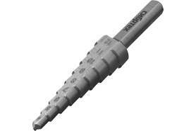 Упростить и ускорить сверление отверстий большого диаметра в листовом металле можно, применив ступенчатое сверло. Все сверла изготовлены из качественной инструментальной стали. Каждая ступенька сверла имеет маркировку фактического диаметра. Лыски на хвостовике препятствуют проскальзыванию сверла в патроне.