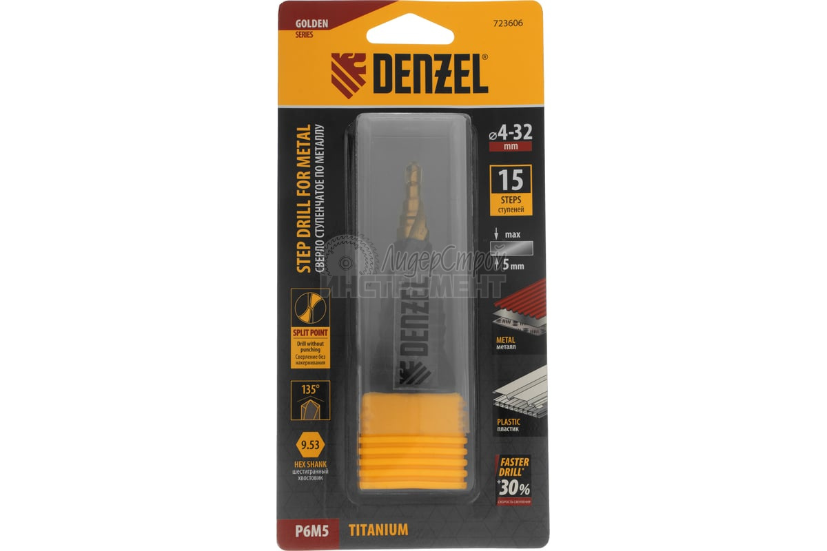 Ступенчатое сверло Denzel 723606 из стали P6M5, с 6-гранным хвостовиком, предназначено для сверления отверстий диаметром от 4 до 32 мм в сталях, цветных металлах и пластике.