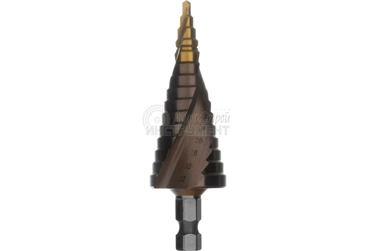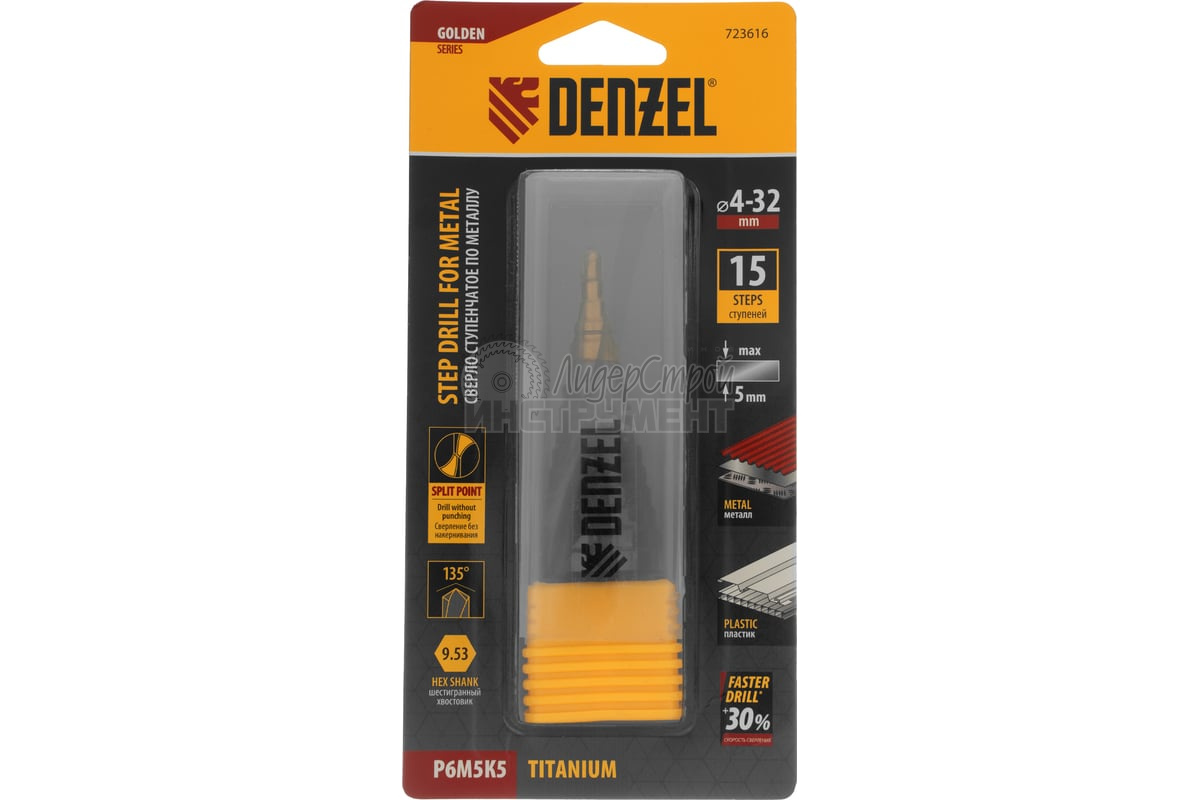 Ступенчатое сверло Denzel 723616 из стали P6M5K5, с 6-гранным хвостовиком, предназначено для сверления отверстий диаметром от 4 до 32 мм в сталях, цветных металлах и пластике.