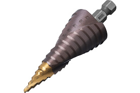 Упростить и ускорить сверление отверстий большого диаметра в листовом металле можно, применив ступенчатое сверло. Все сверла изготовлены из качественной инструментальной стали. Каждая ступенька сверла имеет маркировку фактического диаметра. Лыски на хвостовике препятствуют проскальзыванию сверла в патроне.