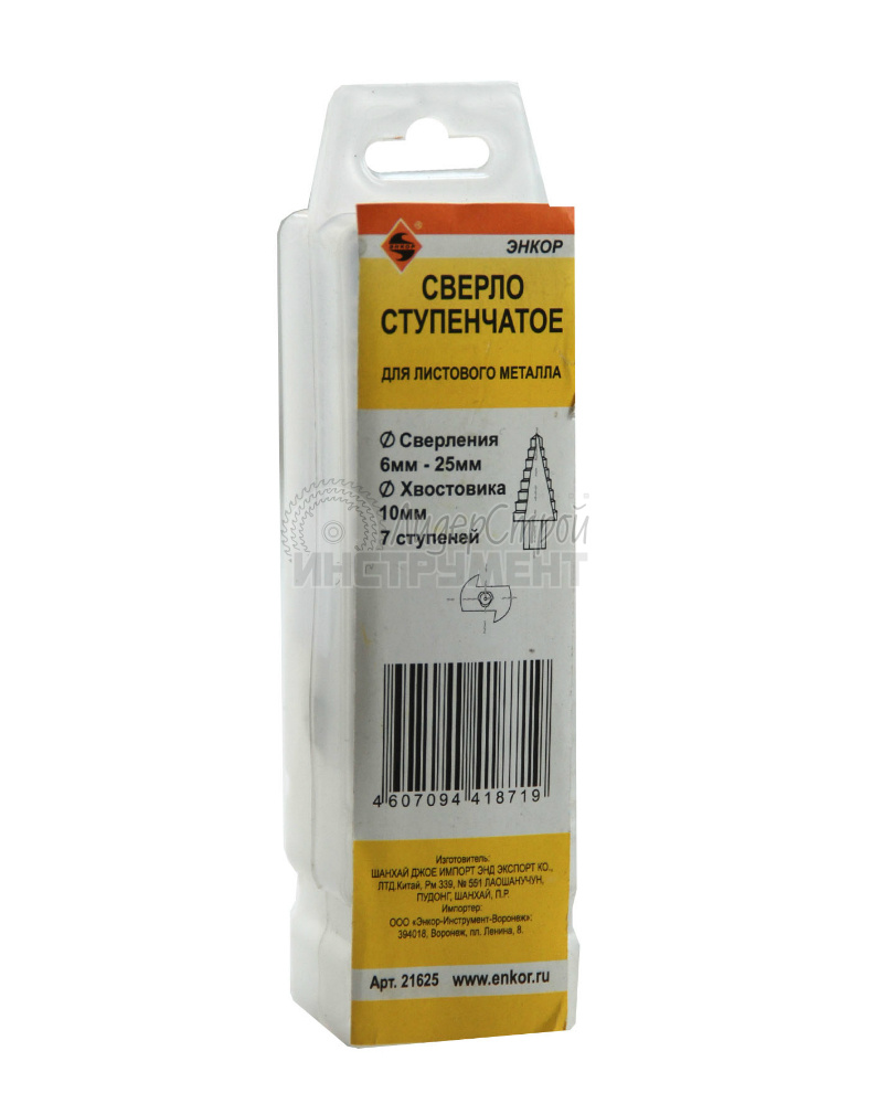 Основной способ применения ступенчатого сверла ЭНКОР (артикул - 21625) - быстрое сверление в листовом металле отверстий диаметром до 25 мм. Материал изготовления - прочная инструментальная сталь. Подходит для электроинструмента с шестигранным патроном