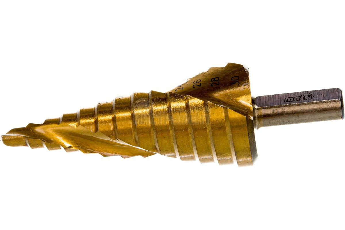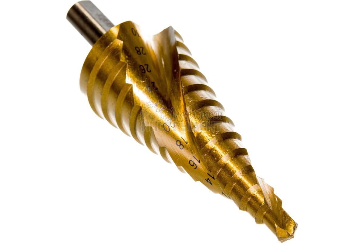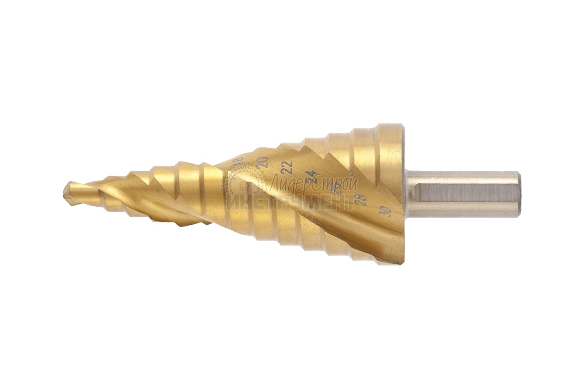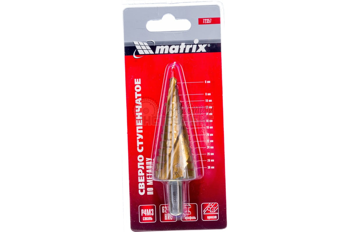 Сверло ступенчатое (6-30 мм; 13 ступеней; HSS) MATRIX 72357 со спиральным профилем и трехгранным хвостовиком, позволяет получать отверстия диаметром 6-8-10-12-14-16-18-20-22-24-26-28-30 мм в материалах толщиной до 5 мм: стали, цветных металлах, нержавейке и пластике.
