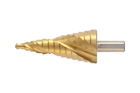 Упростить и ускорить сверление отверстий большого диаметра в листовом металле можно, применив ступенчатое сверло. Все сверла изготовлены из качественной инструментальной стали. Каждая ступенька сверла имеет маркировку фактического диаметра. Лыски на хвостовике препятствуют проскальзыванию сверла в патроне.