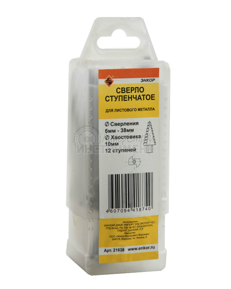 Сверло ЭНКОР (артикул - 21638) имеет ступенчатую конструкцию. С ним сверление по металлу пройдет быстрее и на заготовке не останется заусенцев. Выполняет отверстия до 38 мм. Материал изготовления - высокопрочная инструментальная сталь. Для исключения проскальзывания оснастки в патроне хвостовик имеет лыски.