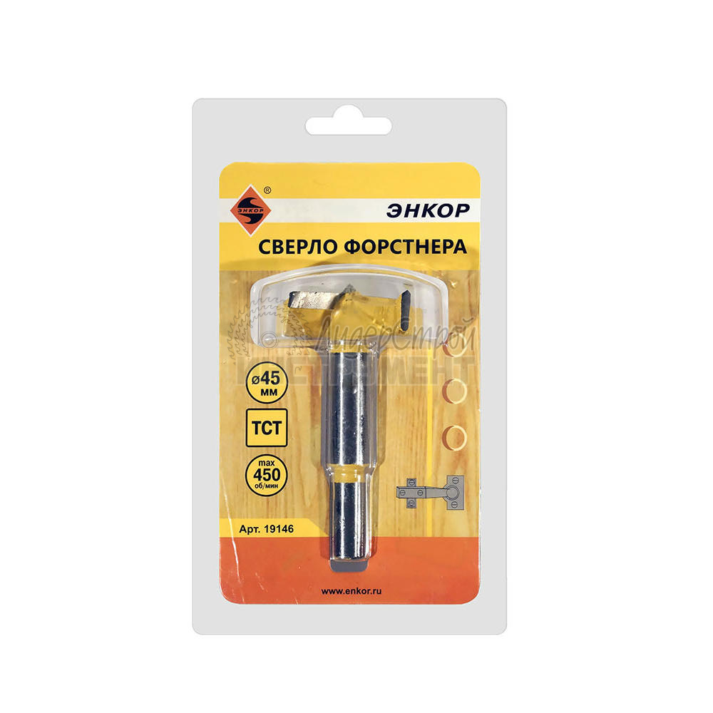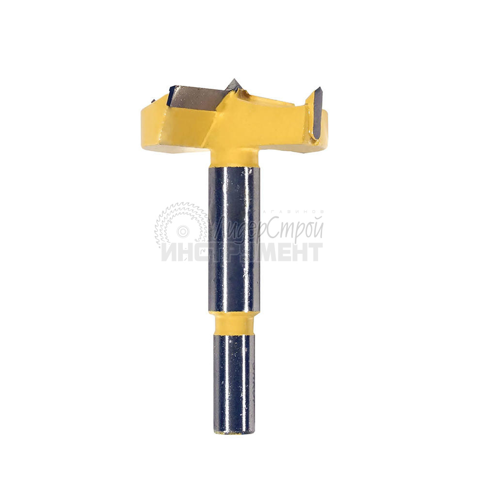 Сверло изготовлено из углеродистой стали и оснащено твердосплавными пластинами для увеличения стойкости и производительности. Предназначено для точного высверливания глухих (несквозных) отверстий большого диаметра на небольшую глубину. Используется при установке мебельных петель в дереве, ламинате и ДСП.