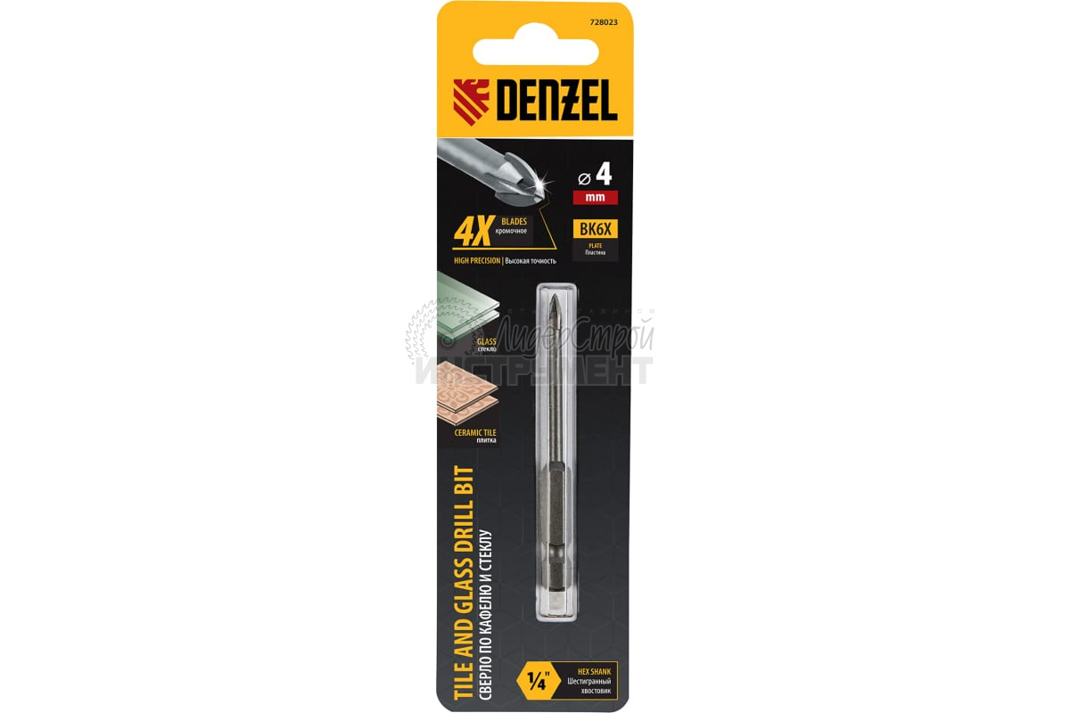 Сверло 4 мм, крестовая пластина, 6-гр. хвостовик Denzel 728023 предназначено для сверления керамической (кафельной) плитки, стекла, мрамора, фарфора с помощью дрели или шуруповерта.