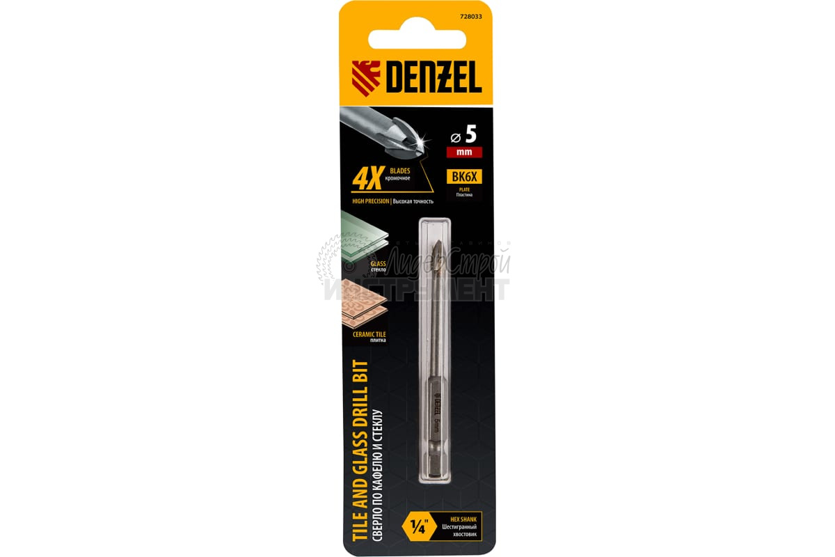 Сверло 5 мм, крестовая пластина, 6-гр. хвостовик Denzel 728033 предназначено для сверления керамической (кафельной) плитки, стекла, мрамора, фарфора с помощью дрели или шуруповерта.
