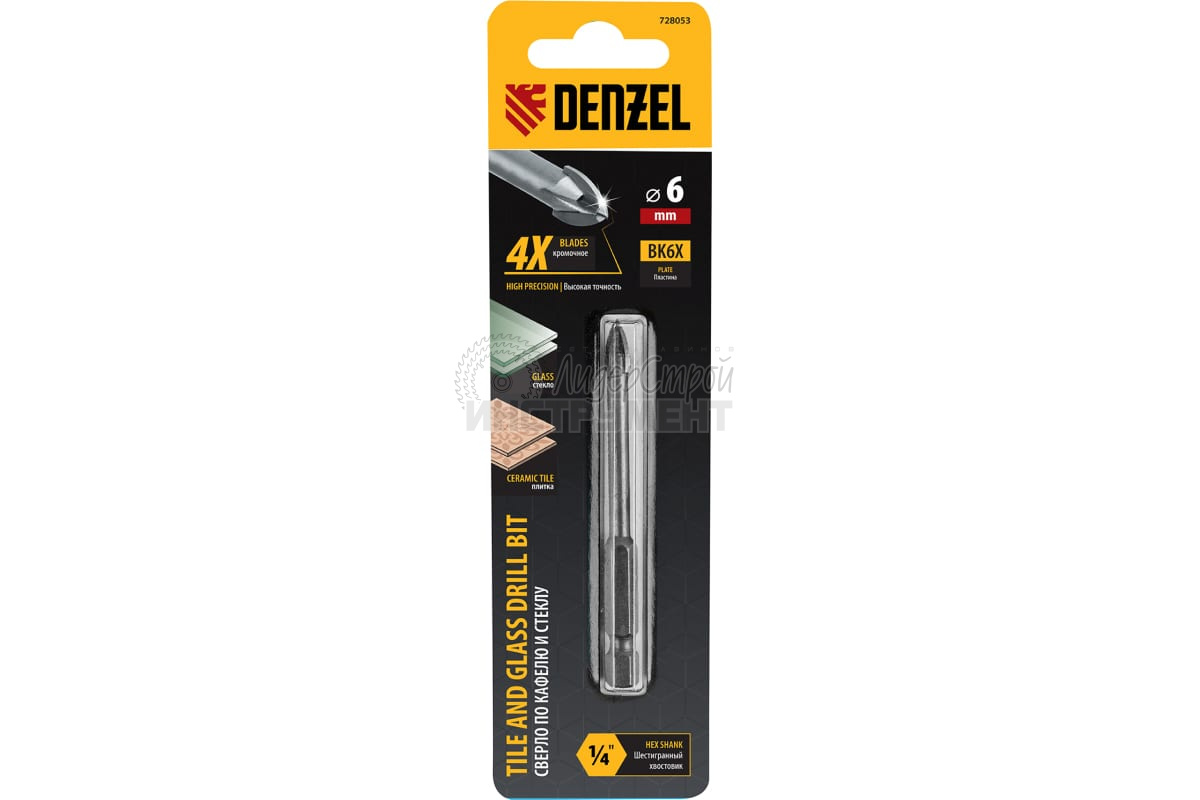 Сверло 6 мм, крестовая пластина, 6-гр. хвостовик Denzel 728053 предназначено для сверления керамической (кафельной) плитки, стекла, мрамора, фарфора с помощью дрели или шуруповерта.