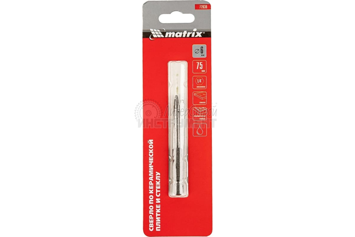 Сверло 6 мм, 6-гранный хвостовик MATRIX 72836 рассчитано на сверление керамической плитки, стекла, мрамора и фарфора. Подходит для интенсивного использования. В процессе работы рекомендуется применять водяное охлаждение для увеличения ресурса сверла.