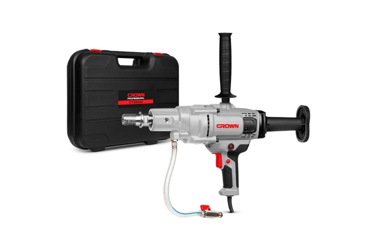 Ручная дрель алмазного сверления Crown CT32035 BMC предназначена для сухого и мокрого сверления отверстий полыми алмазными коронками в бетоне, железобетоне, камне, кирпиче, натуральном камне и в прочих абразивных материалах во время проведения общестроительных работ, отделочных работ, электромонтажных работ, монтажа сантехники, монтажа вентиляции, установки систем вентиляции и кондиционирования, прокладке труб, при проведении дорожных работ, отбора проб и так далее.