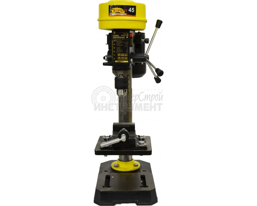 Корвет-45 предназначен для сверления отверстий в заготовках из дерева, металла, пластика и др. материалов. Оснащен асинхронным двигателем на 400 Вт с ременной передачей, защищающей мотор от перегрузки. Подключается к однофазной сети (220 В).