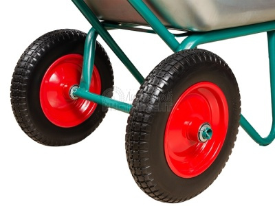 Стальной кузов толщиной 0,7 мм и объемом 110 л для сыпучих грузов имеет цинковое покрытие, обеспечивающее защиту тачки от внешних воздействий.