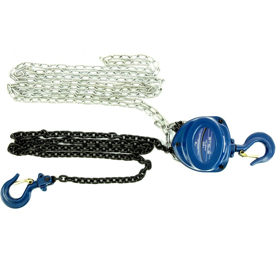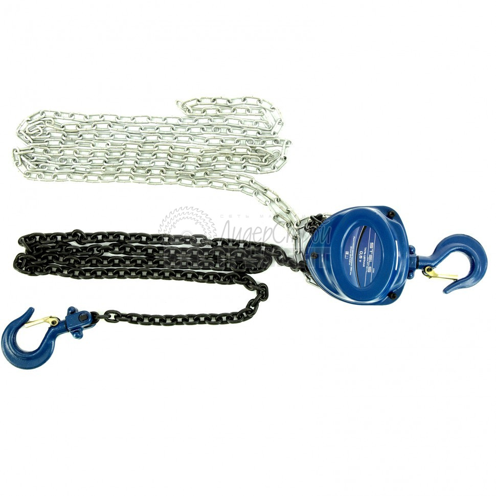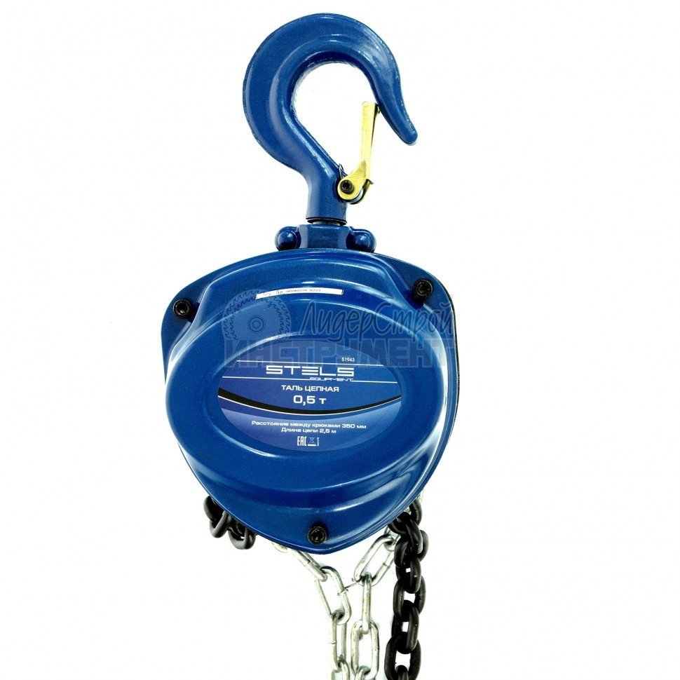 Цепная таль Stels 51943, расстояние между крюками 350 мм, способна поднимать грузы весом не более 0,5 т на высоту до 2,5 м. Устройство с оптимальным передаточным числом не требует больших усилий от оператора в процессе эксплуатации.