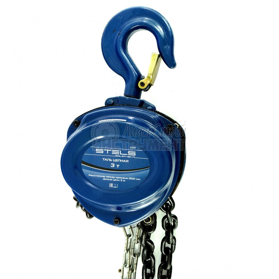 Цепная таль Stels 51947, расстояние между крюками 500 мм, способна поднимать грузы весом не более 3 т на высоту до 3 м. Устройство с оптимальным передаточным числом не требует больших усилий от оператора в процессе эксплуатации.