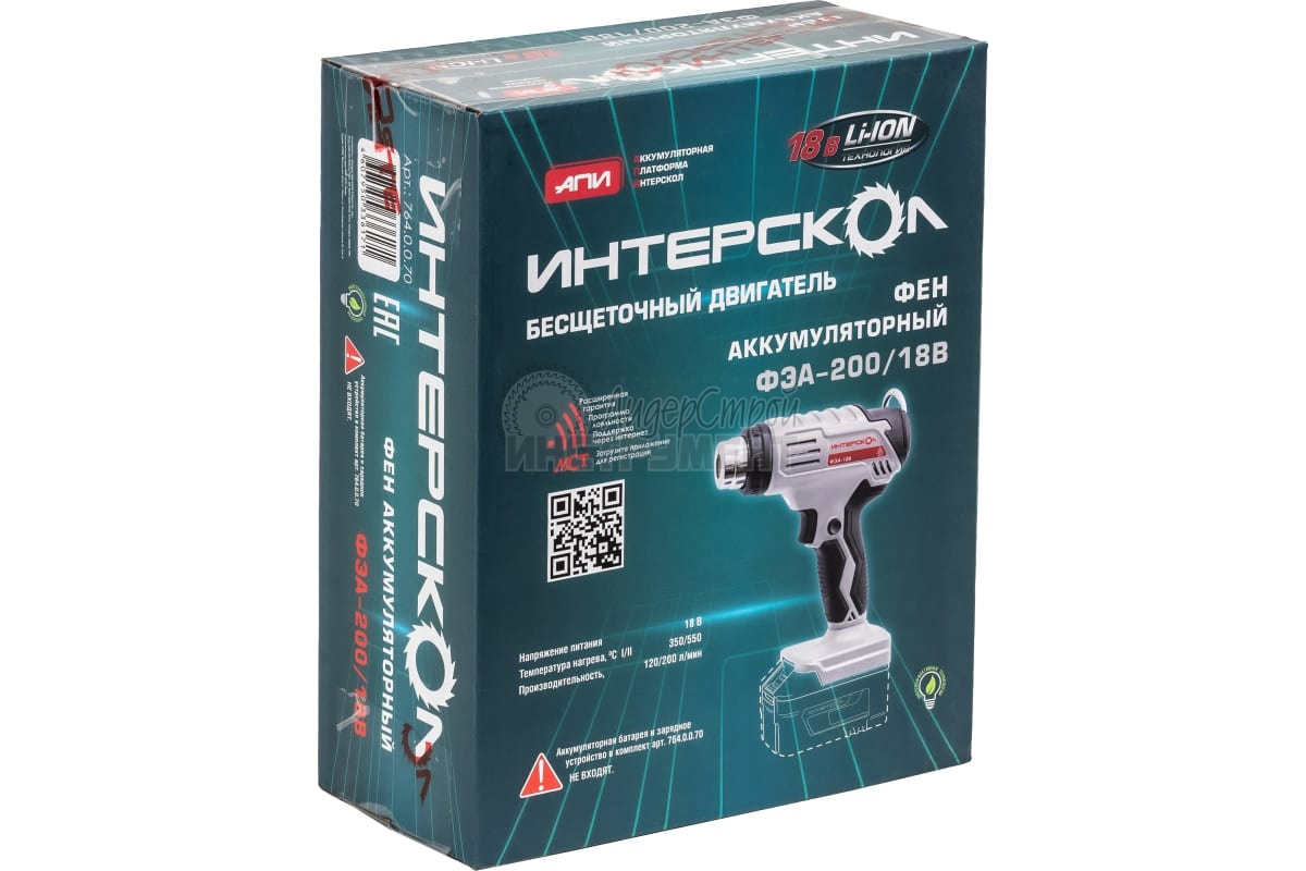 Аккумуляторный профессиональный технический фен ИНТЕРСКОЛ ФЭА-200/18В оснащен бесщеточным приводом, обладающий высокой энергоэффективностью и надежностью по сравнению с аккумуляторными фенами с коллекторными двигателями.
