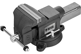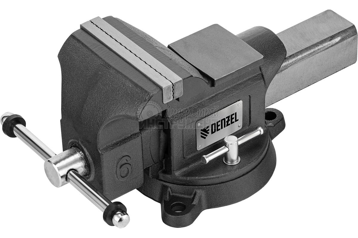 Слесарные поворотные тиски Denzel BVH-150 18685 с губками шириной 150 мм и стальной направляющей предназначены для фиксации деталей и заготовок, а также для выполнения мелких ударных работ — в конструкции предусмотрена наковальня.