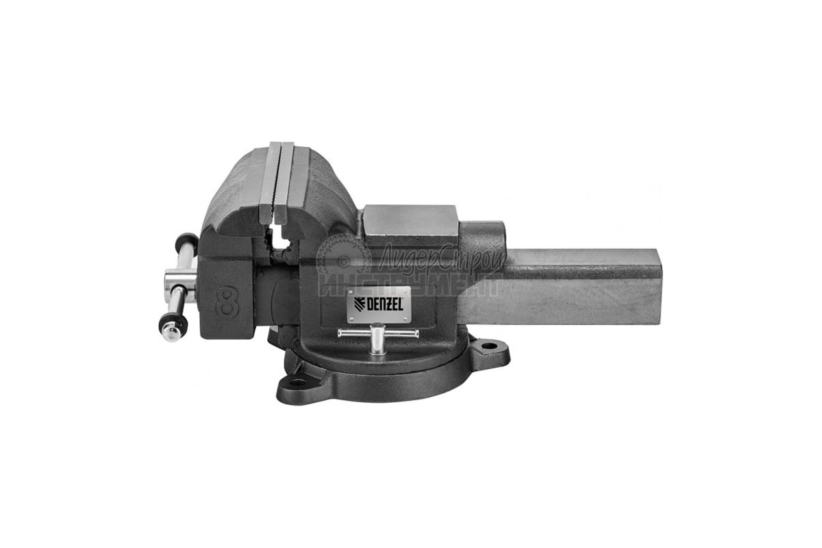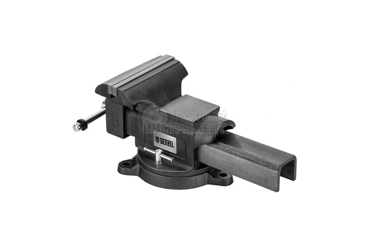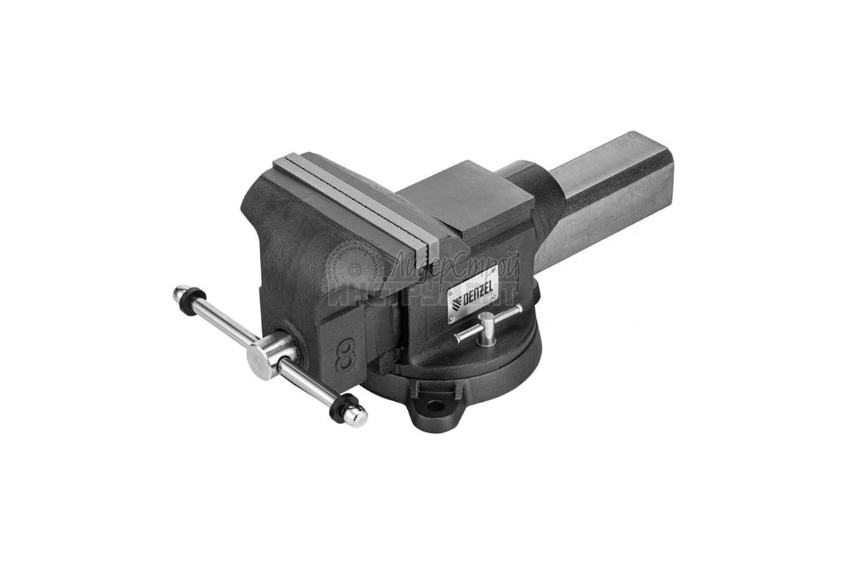 Слесарные поворотные тиски Denzel BVH-200 18686 с губками шириной 200 мм и стальной направляющей предназначены для фиксации деталей и заготовок, а также для выполнения мелких ударных работ — в конструкции предусмотрена наковальня.
