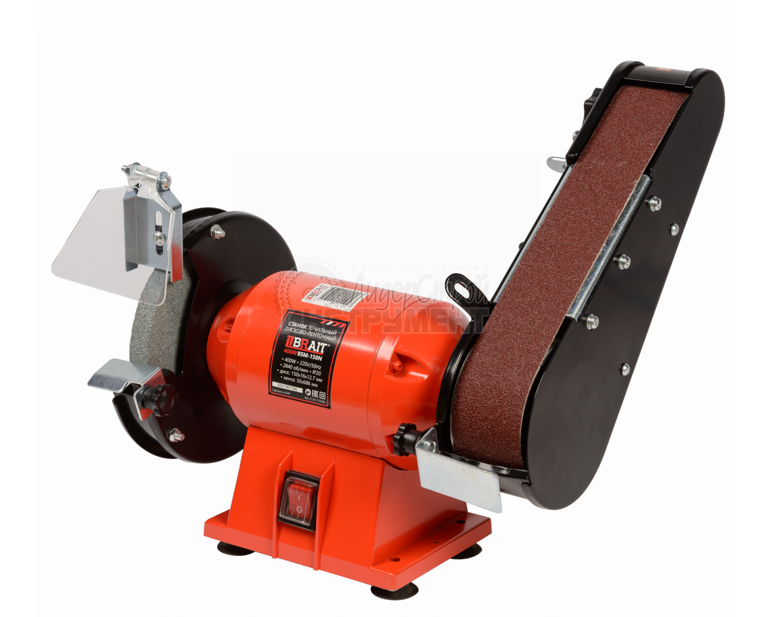 Точильный станок BSM-150N предназначен для заточки всевозможных режущих инструментов. Он оборудован точильным кругом 150 мм и точильной лентой разной зернистости 50х686 мм.