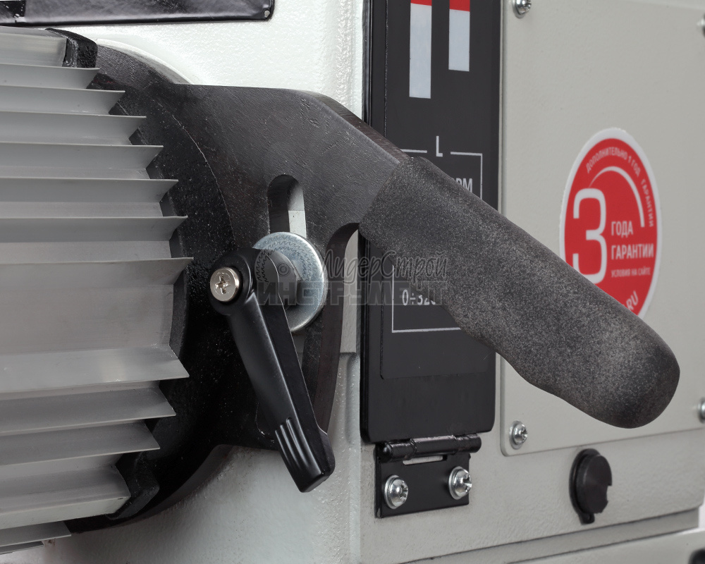 Станок имеет мощный асинхронный двигатель – 1500 Вт. Диапазонов скоростей два: низкий - от 0 до 1200 об./мин., и высокий – от 0 до 3200 об./мин. Скорость регулируется плавно с помощью частотного преобразователя. Отличительная особенность – выносной пульт управления с магнитной фиксацией.