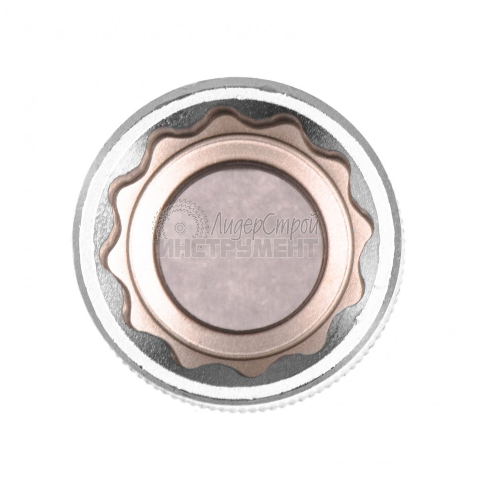 Торцевая головка имеет 12-гранный профиль с увеличенной площадью контакта с деталью, что значительно снижает деформацию граней крепежа при высоких нагрузках и позволяет осуществлять вращение крепежа с меньшим углом поворота (30 градусов) по сравнению с 6-гранным зевом.