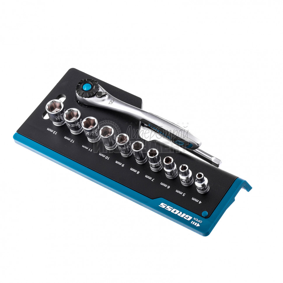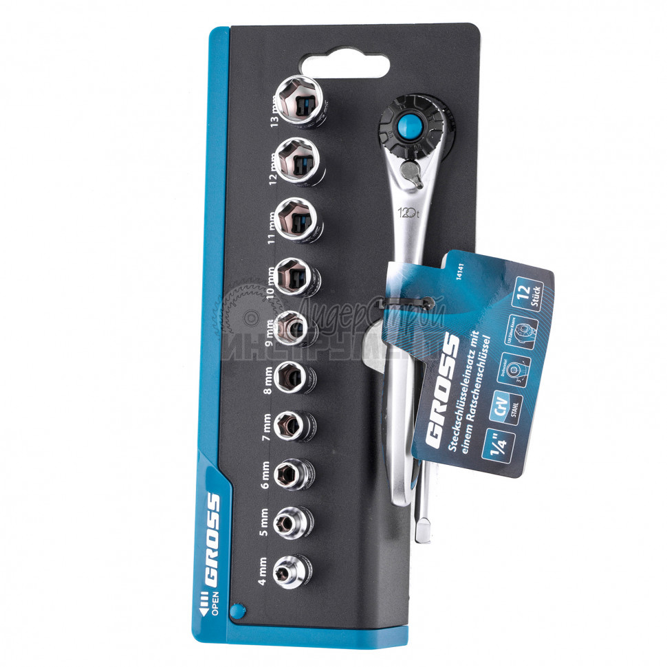 Набор Gross 14141 включает в себя 12 предметов из стали CrV-группы с посадочным квадратом 1/4 дюйма: 10 торцевых головок, трещотку со 120 зубьями и удлинитель 100 мм. Применяется для монтажа и демонтажа резьбовых соединений при проведении технического обслуживания авто или для бытовых ремонтных работ. Набор подходит не только для самостоятельного использования в гараже и дома, но и для профессиональной эксплуатации на станциях техобслуживания.