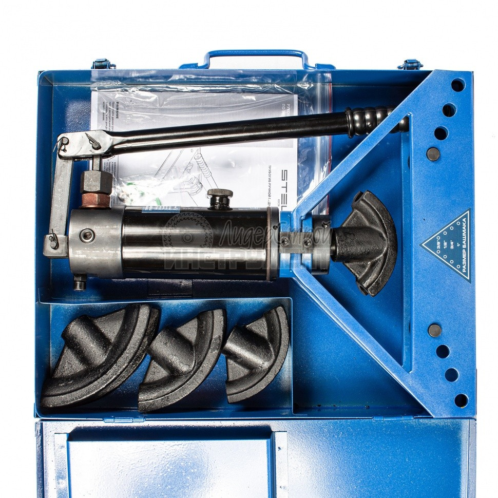 Укомплектована сменными адаптерами для заготовок диаметром 1", 1/2", 3/4". Благодаря гидроприводу от оператора не требуется усилий для проведения операций. Угол максимального сгиба – не более 90 градусов. Поставляется в жестком антиударном кейсе.