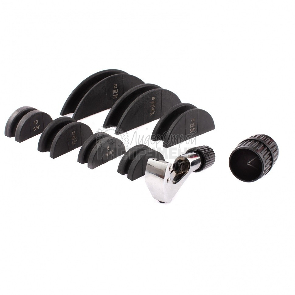 - В комплект входит 7 насадок, которые позволяют сгибать трубы диаметром 6-22 мм и толщиной стенок до 1 мм. За счет небольшого веса трубогиба 4,7 кг работать можно одной рукой.