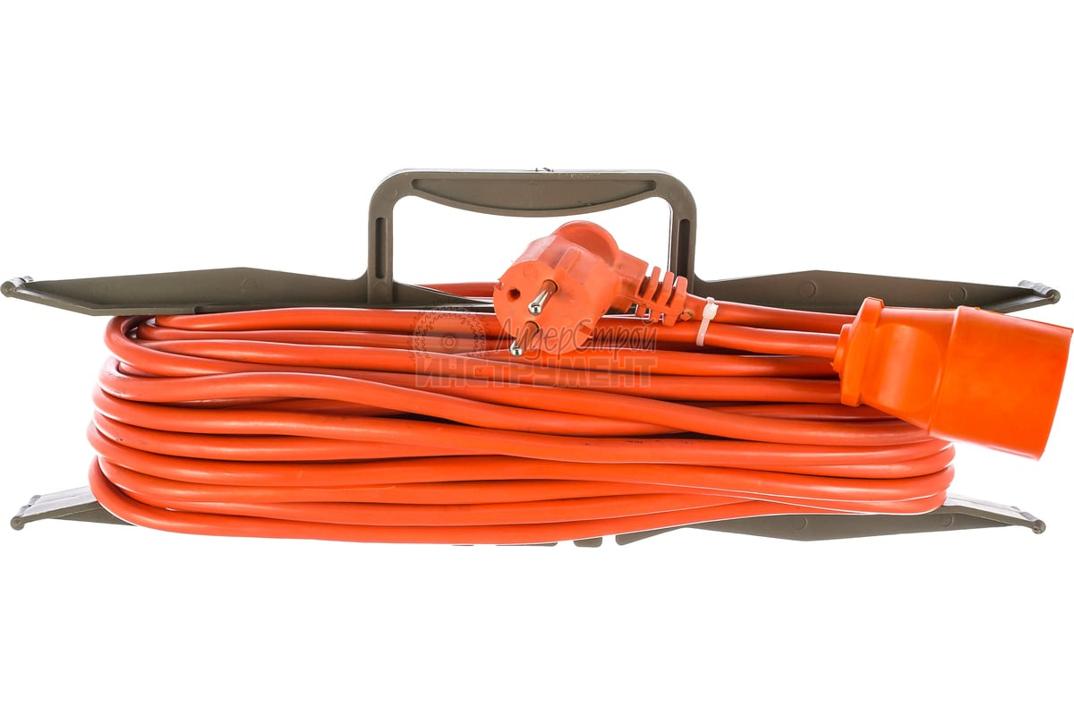 Провод длиной 20 метров расположен на пластиковой рамке с удобной ручкой для скручивания и удержания. Удлинитель имеет одну розетку.