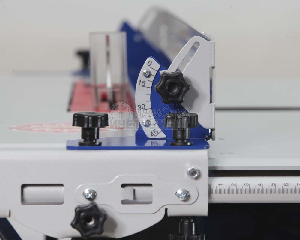 Для ориентации заготовки относительно режущего инструмента станок оснащен линейкой и приспособлением для распиловки под углом.