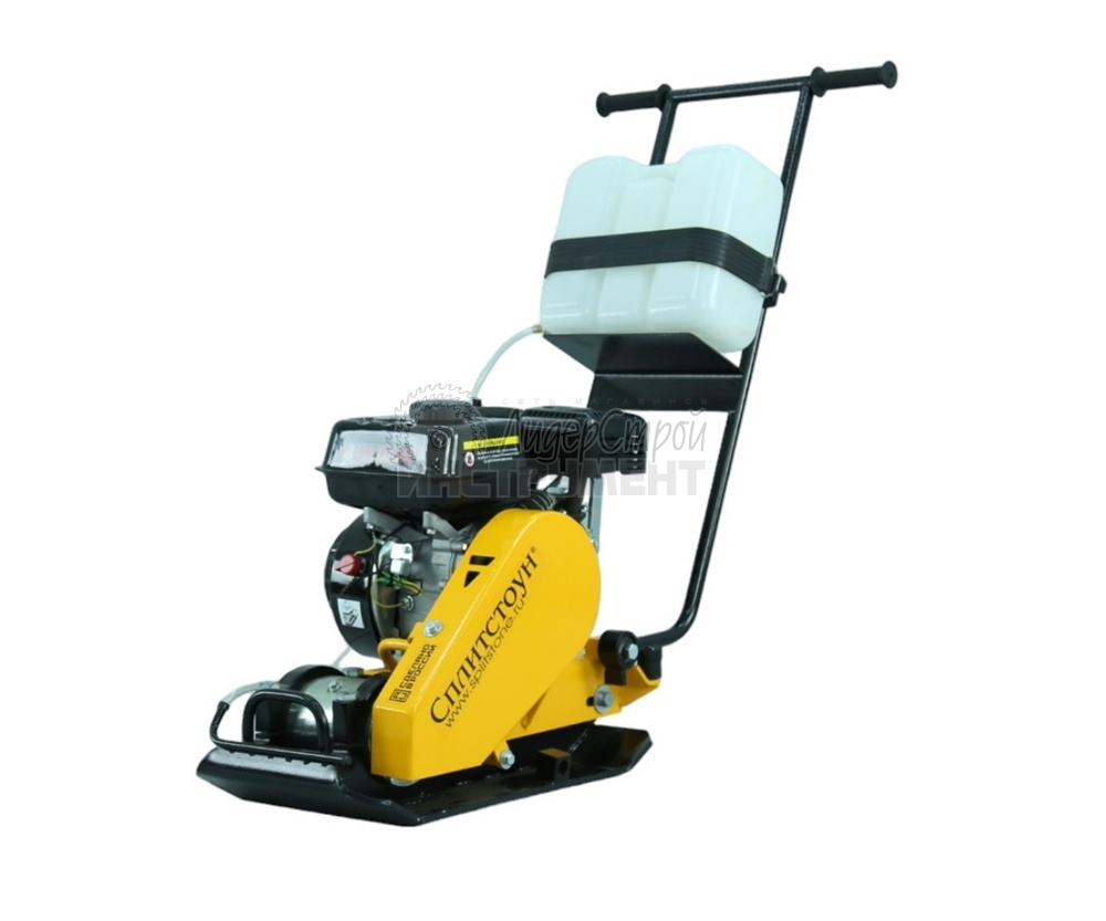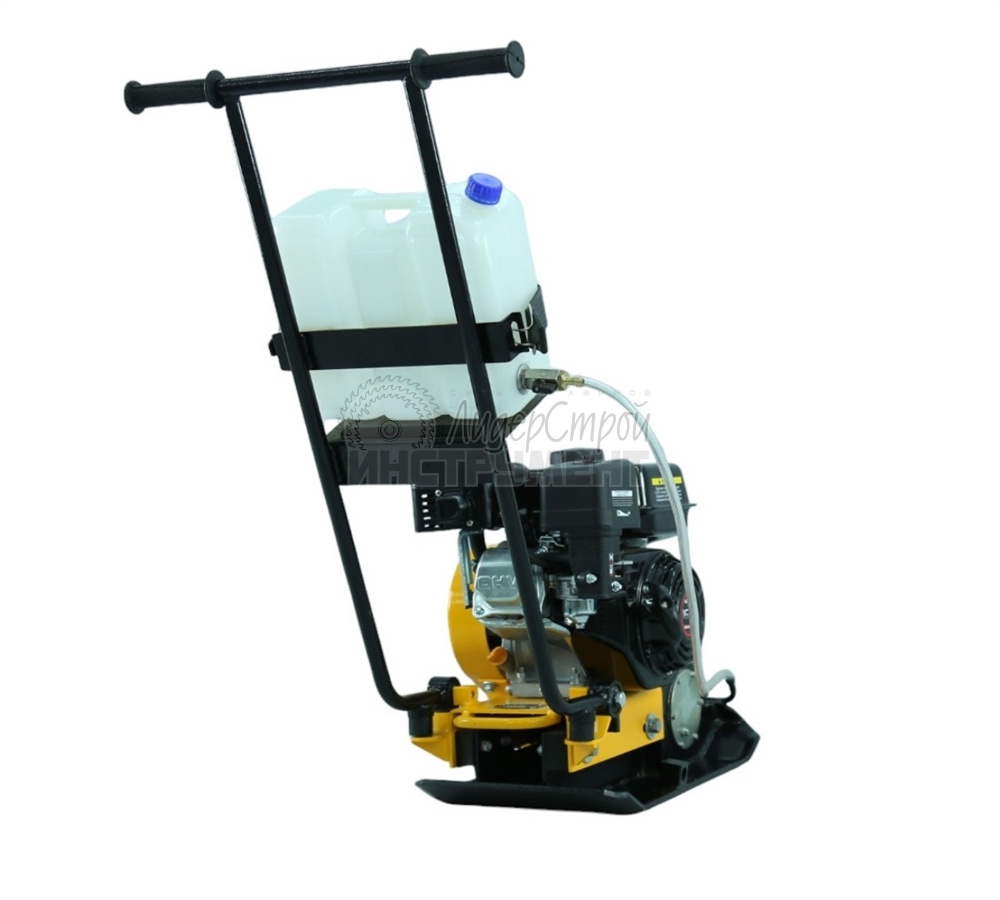 На виброплите предусмотрена система смачивания основания плиты. Наличие системы орошения рабочей поверхности является обязательным условием для успешного проведения работ по уплотнению асфальтобетонных смесей. Смачивание поверхности материала исключит его налипание на подошву плиты. На виброплите установлен бак для воды. Бак для воды представляет собой пластиковую ёмкость объёмом 10 л, которая обеспечивает длительную работу с увлажнением рабочей зоны. На баке установлен шаровой кран, соединённый специальным шлангом с основанием плиты. Удачное расположение бака (рядом с оператором) не случайно – вода уменьшает воздействие вибрации на руки оператора.
