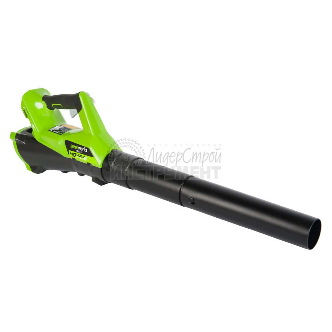 Воздуходув аккумуляторный Greenworks из линейки устройств 40 вольт G40AB - предназначен для уборки любых территорий от опавших листьев, легкого мусора и пыли. Это новая модель воздуходува с осевой конструкцией вентилятора. Такой тип вентилятора обладает высокими показателями скорости воздушного потока - 177 км/ч и объема воздушного потока - 8,5 м³/мин. Таким образом этот воздуходув сопоставим по мощности с бензиновыми аналогами, но в отличии от бензиновых аналогов он абсолютно экологичен, на несколько порядков менее шумный, отсутствуют какие либо вибрации, совсем небольшой вес (всего 1,54 кг.!), а так же прост в эксплуатации - не требует подготовки масло-бензиновой смеси и какого-либо обслуживания. На ручке есть колесико для плавной регулировки скорости потока воздуха, с фиксацией курка в необходимое положение. Еще одна особенность - правильная развесовка устройства. Оно сбалансированно таким образом, чтобы кисть руки не уставала при длительной работе. Согласитесь, это довольно внушительные достоинства, чтобы с умом подойти к покупке и значительно упростить свои работы, например, на приусадебном участке. Воздуходув работает от аккумуляторной батареи G-MAX 40V, которую можно использовать с другими устройствами из линейки устройств GreenWorks 40V.