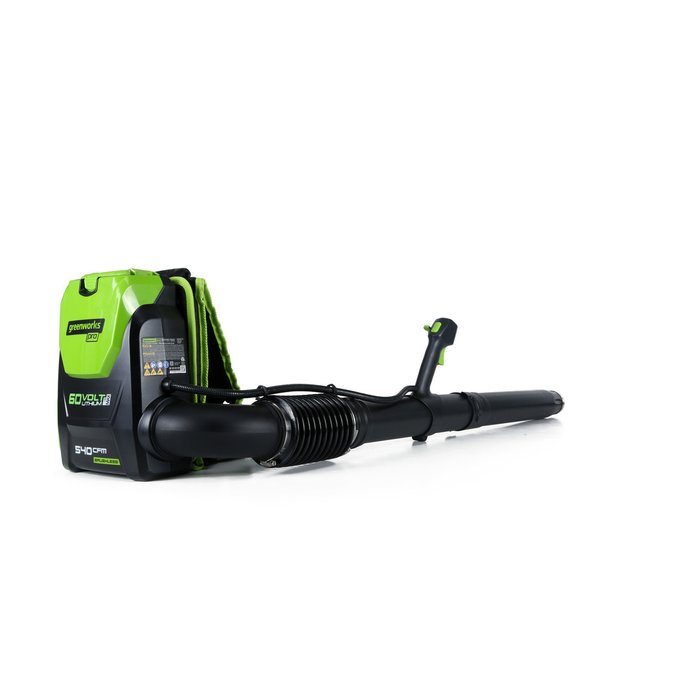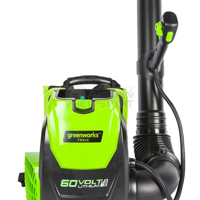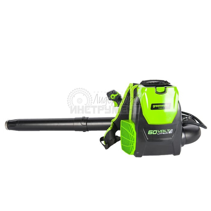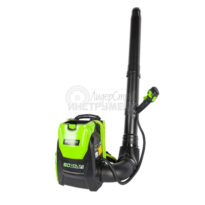 Воздуходувка ранцевая аккумуляторная Greenworks из линейки устройств 60 вольт (модель GD60BPB) – отличный выбор для продолжительных работ по уборке территорий от опавших листьев, пыли и прочего мусора.